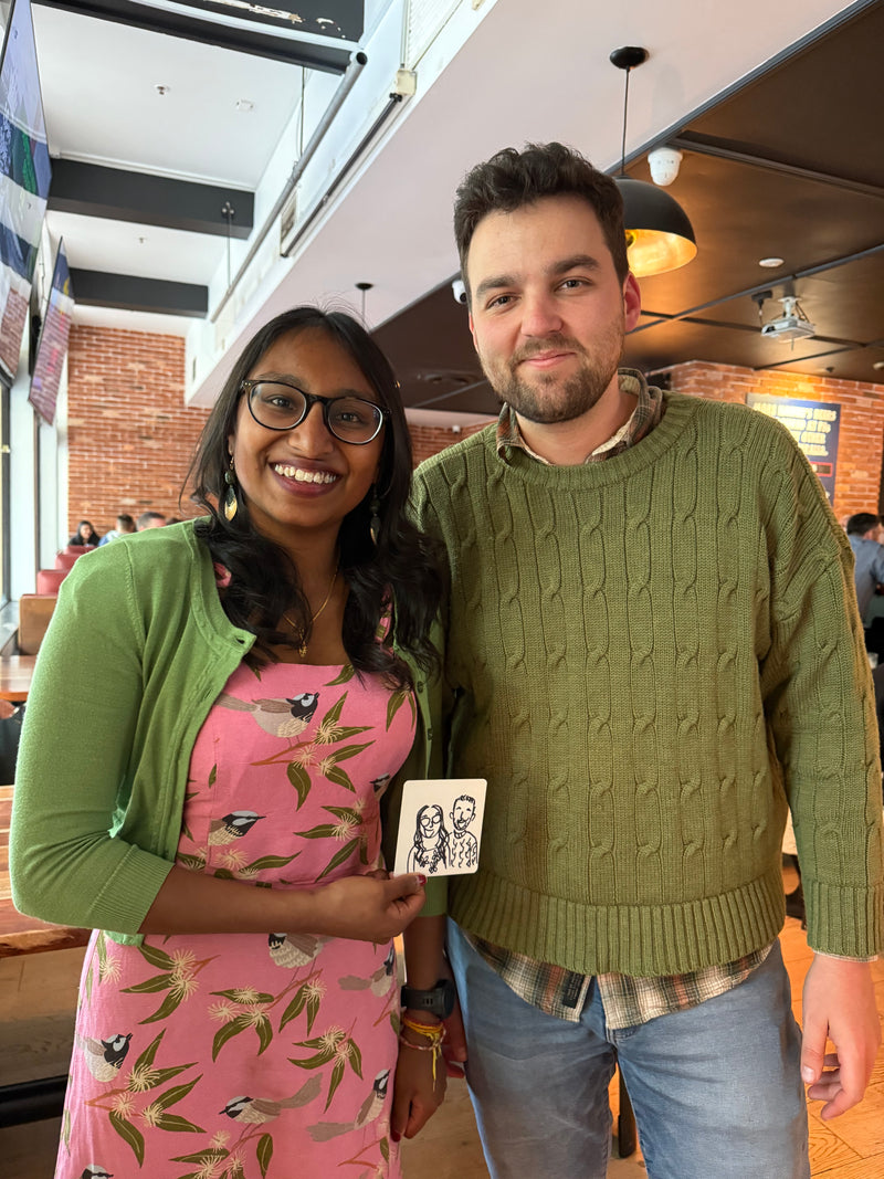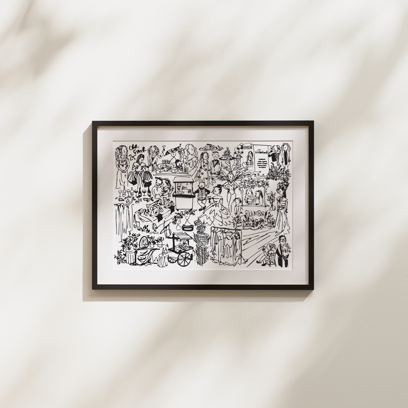As the event unfolds, I sketch the details that matter; the cheers, the cake, the quiet moments and loud laughs. These illustrations are then composed into a collaged artwork: a visual love letter to your event.