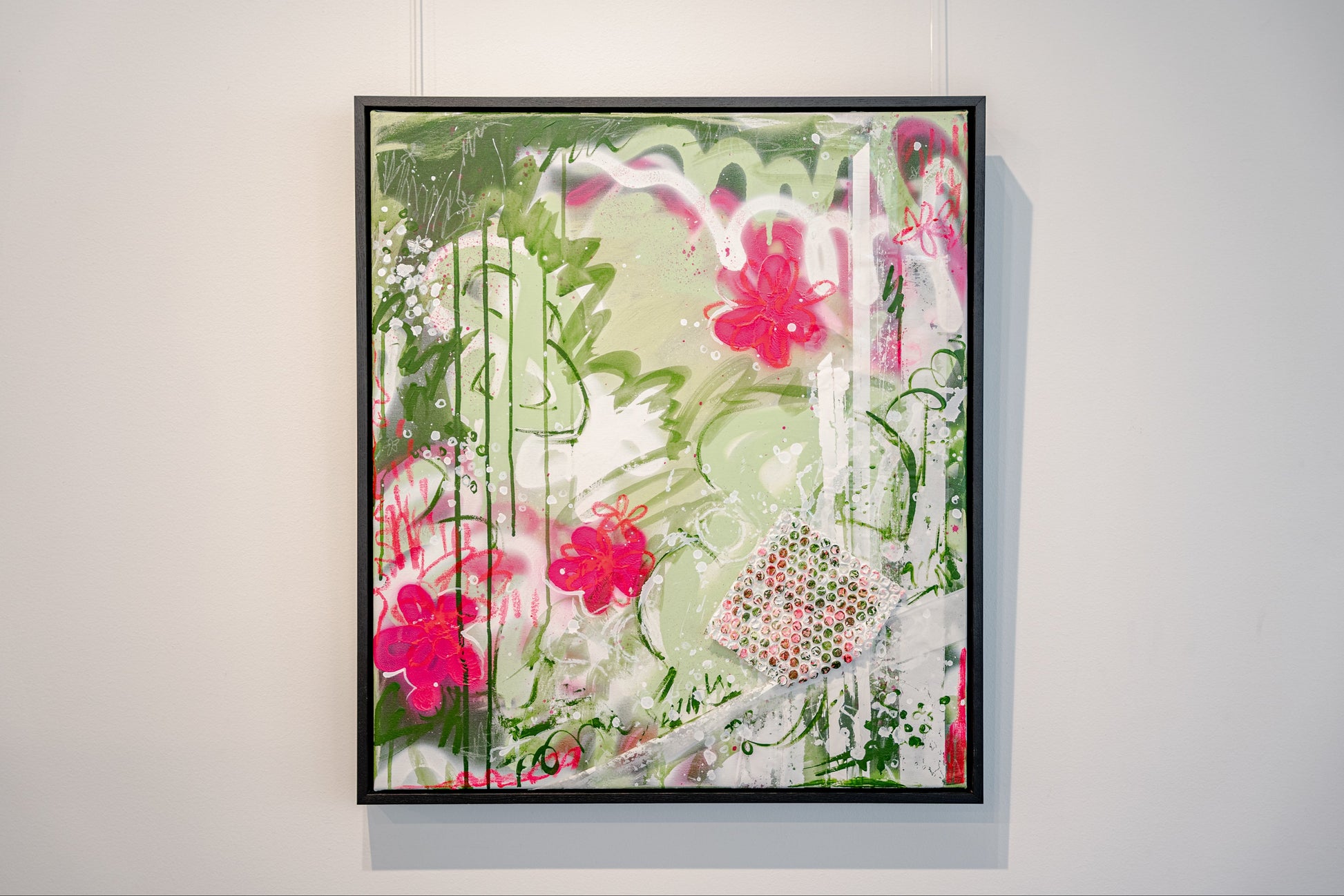 Acrylic, oil stick, spray paint, packaging tape, chalk & bubble wrap on canvas (framed).