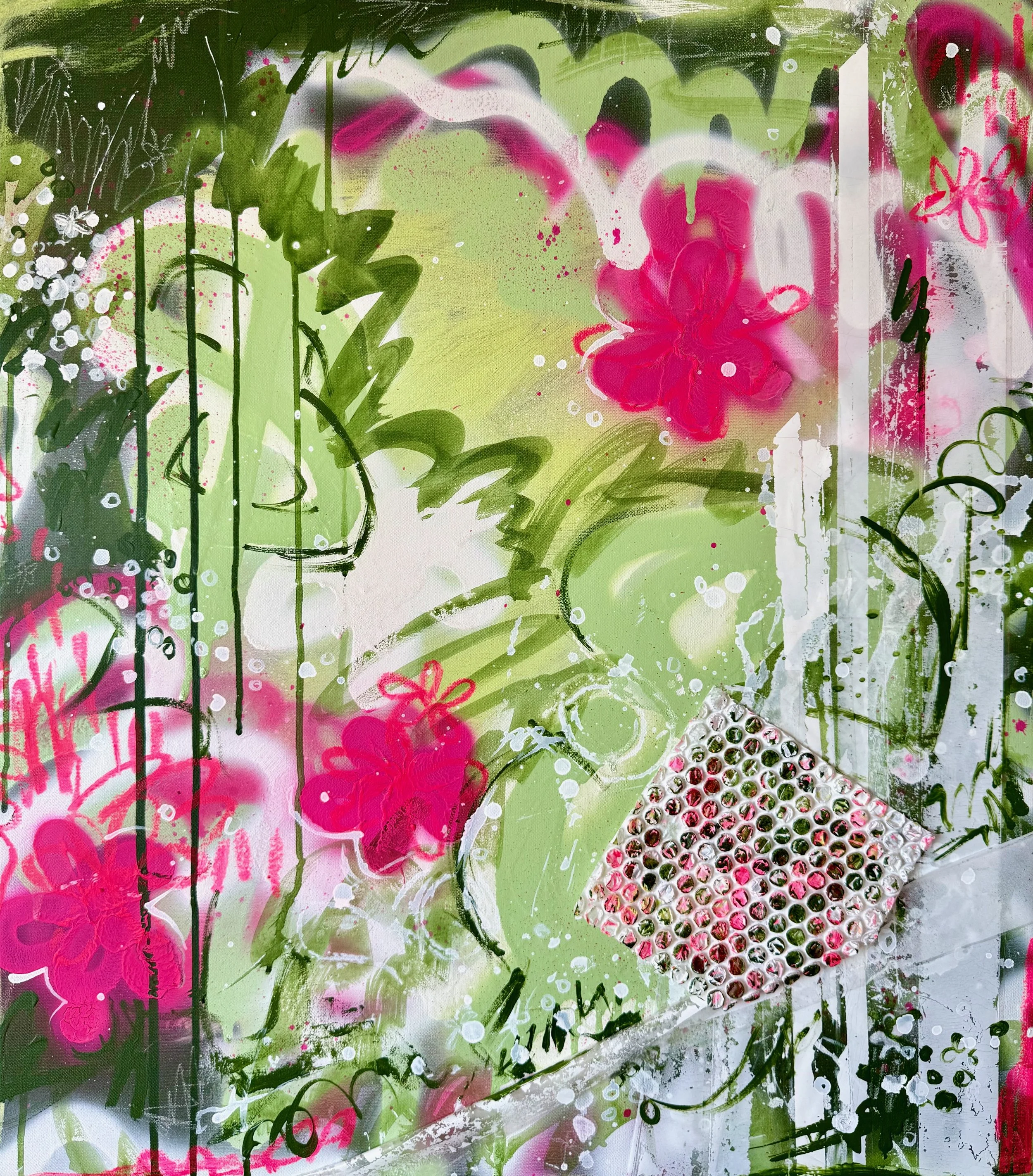 The piece that sparked the exhibition – a swirl of graffiti-like marks and dripping paint. Envy, Upcycled explores how comparison with others seeps and stains. Pink spreads like envy itself… contagious, consuming and impossible to ignore, but with reflection, it becomes something softer, a reminder to turn outward comparison into inward growth
